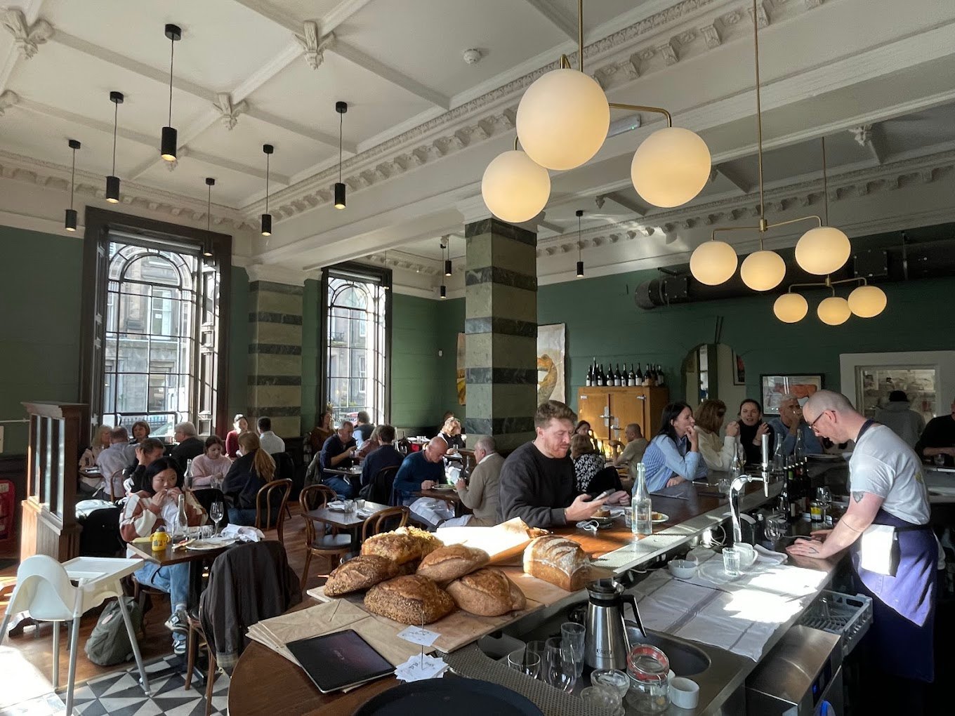 The Palmerston in Edinburgh, located in a grand former bank building on Palmerston Place in the West End, offers a classic yet contemporary dining experience. The high ceilings and original architectural details give it an impressive feel, while the stripped-back décor creates a relaxed and comfortable atmosphere. It’s a place that feels both grand and welcoming, making it a popular spot for locals and visitors alike.